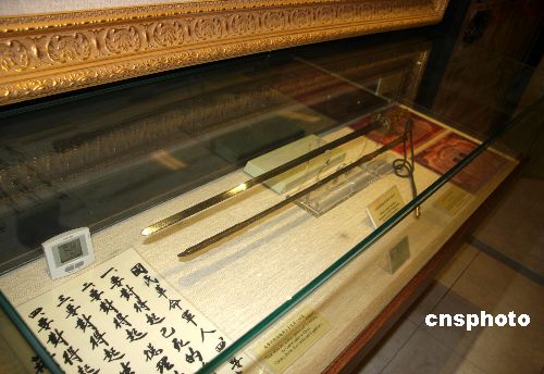 臺北歷史文物館展出蔣介石在北伐戰爭時期使用過的指揮刀。中新社發 陳立宇 攝