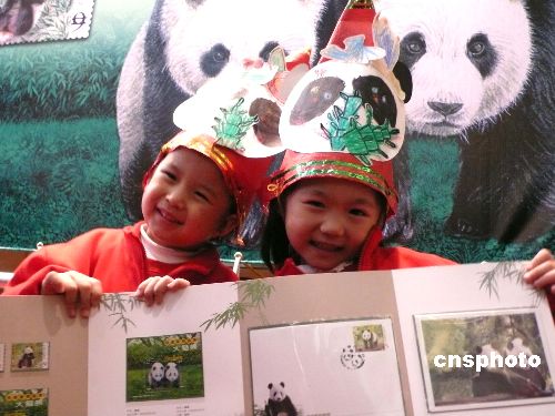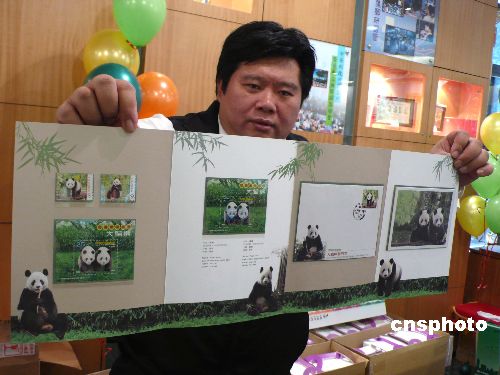 1月20日,為慶祝大陸贈臺兩只大熊貓“團團”“圓圓”到臺灣落戶,臺灣“中華郵政”舉行“可愛動物郵票——大熊貓”郵票及郵折發行典禮。本次發行的大熊貓郵票一組含郵票兩枚及小型張一張,分別為大熊貓團團(面值新臺幣五元)、圓圓(面值九元)和團團圓圓小型張(面值二十五元),各發行一百萬張。“可愛動物郵票——大熊貓”郵折一本,內含上述大熊貓郵票一組、小型張樣張一張、貼有團團郵票的首日封及原圖明信片一組三張,每本售價新臺幣一百八十元,限量二萬五千套。中新社發 路梅 攝