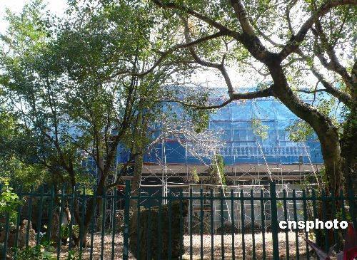 蔣介石和宋美齡的故居——士林官邸的正房目前正在全面修繕中,修繕工程約將耗時一年半,計(jì)劃于2009年11月17日竣工。士林官邸前身為日據(jù)時代的士林園藝試驗(yàn)分所,正房于1950年完成,為一棟兩層水泥建物,外墻為深綠色,有隱蔽作用,內(nèi)部則以住家格局設(shè)計(jì),木造地板,鋪瓦屋頂。圖為正房的前門入口,已經(jīng)被藍(lán)色的紗布圍住。修繕工程竣工后,正房最快將于今年年底開放供民眾參觀。中新社發(fā) 路梅 攝