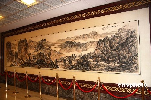 張大千、黃君壁、溥心悆有中國畫渡海來臺三大家之稱。圖為臺灣戲劇院中懸掛的黃君壁與人合作的大幅國畫作品“膴膴原川”。渡海來臺三大家雖均已故去,但許多作品卻在臺灣保留下來。中新社發 陳立宇 攝