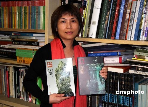 一套共十二冊由北京故宮博物院紫禁城出版社授權、介紹北京故宮博物院藏寶的書籍,由臺灣藝術家出版社出版。圖為該出版社的工作人員展示該套書籍中的兩冊。中新社發 陳立宇 攝