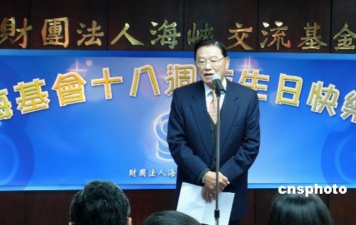 三月九日,臺灣海峽交流基金會在臺北舉辦成立十八周年慶祝活動。該會董事長江丙坤表示,兩岸“大三通”基本實現(xiàn)后,其效果逐漸顯現(xiàn),海基會未來將會繼續(xù)推動兩岸制度性協(xié)商,共期兩岸和平,經(jīng)濟繁榮。中新社發(fā) 路梅 攝