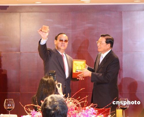 大陸海協(xié)會(huì)副會(huì)長(zhǎng)安民四月六日率“海協(xié)會(huì)經(jīng)貿(mào)交流考察團(tuán)”一行十四人抵達(dá)臺(tái)灣,開(kāi)始為期七天的訪問(wèn)。臺(tái)灣海基會(huì)董事長(zhǎng)江丙坤在香格里拉臺(tái)北遠(yuǎn)東國(guó)際大飯店宴請(qǐng)安民一行。 中新社發(fā) 耿軍 攝
