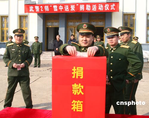 2月3日,駐江蘇宜興武警部隊舉行“雪中送炭”捐款活動,官兵們向宜興慈善會捐款73540.5元,這些善款不久將轉送到災民手中。中新社發 丁煥新 攝
