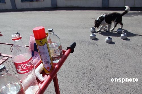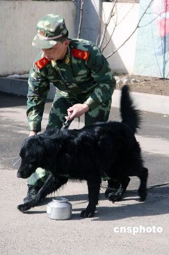 3月19日,武警戰士在對消防搜救犬進行訓練。沈陽市消防支隊特勤三大隊的消防搜救犬堪稱中國工作犬中的“特種兵”,很多搜救犬具備識別20多種氣味的能力,對機油、汽油、柴油、信那水等常見的易燃易爆液體及丙烷等可燃氣體的氣味的識別率達到100%。它們既可作為尋找鑒別爆炸源及燃燒源的搜救犬,又完全可以勝任機場、車站等重要地區的安檢工作犬。中新社發 趙敬東 攝