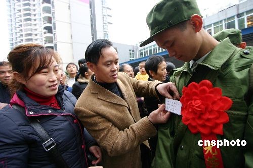 11月19日,進藏新兵在親人們的歡送下離開家鄉。當日,重慶市永川區首批進藏新兵在區人武部大院集中,完成了相關交接手續后,新兵們在親人的祝福聲中,登上大巴車依依不舍地告別親人、告別故鄉,踏上了保家衛國的征程。中新社發 陳仕川 攝