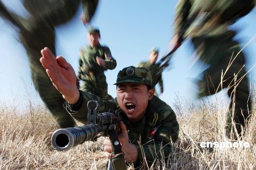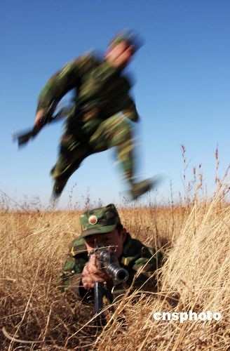 2008年12月25日,濟南軍區某部正在組織官兵進行戰術訓練。連日來,該部把官兵拉到野外生疏地域,著力開展嚴寒條件下的冬季野營訓練,全面鍛煉部隊在嚴寒條件下的整體作戰能力。中新社發 梁志杰 攝