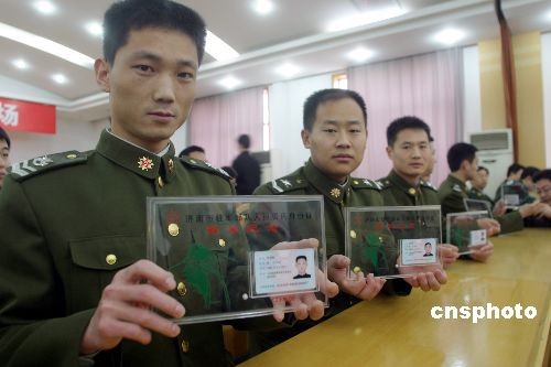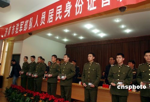 2009年2月26日,濟南警備區、濟南市公安局聯合舉行駐濟部隊現役軍人居民身份證首發儀式。自此,濟南市為駐濟部隊申領發放具名身份證工作正式啟動。此舉將對部隊人員辦理儲蓄、保險、買車、購房等涉及個人權益事物時帶來便捷。中新社發 龔輝 攝