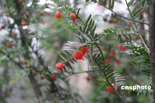 10月中旬,浙江桐廬瑤琳鎮姚村杭州桐廬瑤琳紅豆杉有限公司基地的一株紅豆杉樹開花結果,果實達500余顆。據介紹,這株紅豆杉樹6年前從外地引進。背景資料:紅豆杉,又稱紫杉,也稱赤柏松,屬常綠喬木,由于在自然條件下紅豆杉生長速度緩慢,再生能力差。由于紅豆杉的提取物紫杉醇具有獨特的抗癌機理,被認為是對多種癌癥療效好、副作用小的新型抗癌藥物,上世紀80年代末90年代初以來,中國的野生紅豆杉,在短短的十幾年中遭到毀滅性砍伐和破壞,野生存量銳減。中國林業部1992年將其列為一級珍貴保護樹種。中新社發 何小華 攝