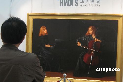 全亞洲最大規(guī)模的藝術(shù)品展示交易平臺(tái)——二○○七(第十一屆)上海藝術(shù)博覽會(huì)十一月十五日起在上海世貿(mào)商城舉行,眾多海內(nèi)外實(shí)力畫(huà)廊或機(jī)構(gòu)均攜其得意之作前來(lái)參展。圖為由上海華氏畫(huà)廊參展的已故大師陳逸飛油畫(huà)代表作《二重奏》,這是陳逸飛音樂(lè)題材肖像畫(huà)中尺寸最大的一幅,也是他當(dāng)年轟動(dòng)美國(guó)藝術(shù)界的重量級(jí)油畫(huà)作品。中新社發(fā) 孫璐 攝