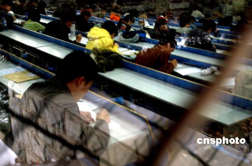 1月19日,北京中國人民大學,碩士研究生考生在應試。當天,2008年全國研究生招生考試開始舉行,教育部公布的數字顯示,全國碩士研究生報名人數為120萬,比去年的128.2萬減少8.2萬,這是2001年以來報考人數首次下降。中新社發 楊慧峰 攝