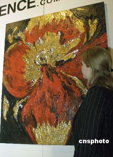 第三十屆紐約藝術博覽會28日在曼哈頓開幕,為期5天的博覽會將展出數十個國家的近千名藝術家的美術、雕塑、攝影等藝術作品。圖為來自丹麥的一名藝術家以黃金為創作材料的油畫作品《花》。中新社發 鄧悅 攝