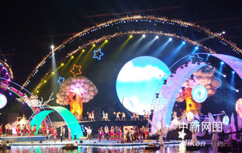 第四屆中國國際動漫節(jié)開幕式晚會現(xiàn)場,晚會由“心”、“情”、“夢”三個篇章組成,充分體現(xiàn)了“多彩動漫品質(zhì)生活”的主題。 周翌 攝