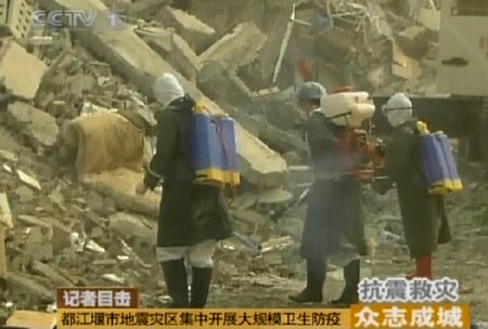地震救援實施的同時,都江堰市地震災區展開大規模衛生防疫。(電視截圖)