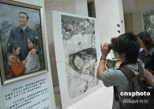 5月23日,“心系汶川·畫的慰問——廣州美術學院師生美術作品特別展”在廣州美術學院美術館展出,638件作品是該校離退休老藝術家、在校師生和畢業生等為四川汶川大地震災區捐出的力作,義賣后款項將全部支援地震災區。中新社發 羅仰明 攝