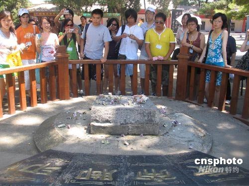 七月六日,英國優秀華裔青少年夏令營拜謁黃帝陵。圖為營員門在參觀“黃帝腳印石”。中新社發 冽瑋 攝