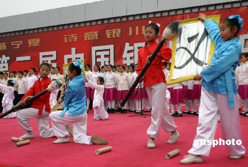 2008年11月12日上午,“回歸詩教傳統、重溫訓蒙養正——第二屆中國銀川音樂詩歌節”在寧夏首府銀川開幕。 本屆詩歌節以“和諧寧夏、詩意銀川”為主題,以“喚醒詩教、訓蒙養正”為主要內容。活動主辦方希望以誦讀表演的形式,通過誦讀中華經典詩文,傳播民族優秀文化,展示中國傳統詩教文化的風采和詩歌的魅力。中新社發 蘆河 攝