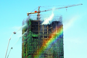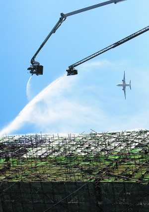 下午3時,站在該樓西南側的日新路上能看到,全樓16層至20層外圍腳手架上的綠色防塵罩已在大火中化為灰燼。盡管兩條水柱正從離地60余米高的云梯上朝著樓內猛烈噴射,但是由于風大吹歪了水柱,高空的水霧甚至在晴空下形成了兩道彩色長虹。