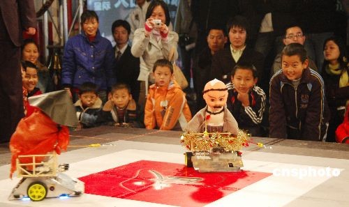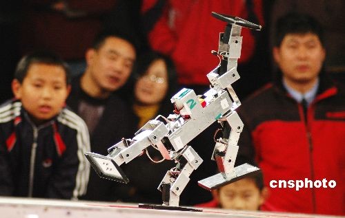 12月20日,“2008中國機器人大賽活動在蘇州木瀆科技創業園舉行,來自全國各款頂級版智能機器人紛紛走臺亮相。這些機器人可以完成走路、翻滾、伏地挺身及單腿平衡等接近于人體活動的各種動作,吸引了數百名機器人愛好者前來觀戰。中新社發 朱子寒 攝