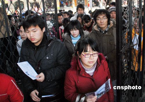 2009年1月10日,安徽省51860名考生走進(jìn)考場(chǎng)參加2009年全國(guó)碩士研究生入學(xué)考試,報(bào)考人數(shù)比上年增加1876人。據(jù)悉,躲避就業(yè)壓力是考研大軍只增不減的一個(gè)重要原因。中新社發(fā) 從啟 攝