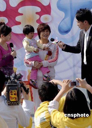 三月十五日,由南方電視臺少兒頻道主辦的“第三屆長安寶寶大賽”啟動儀式在廣東東莞東城文化中心舉行。奧運冠軍冼東妹與她的女兒參加比賽后接受媒體采訪。中新社發 劉衛勇 攝