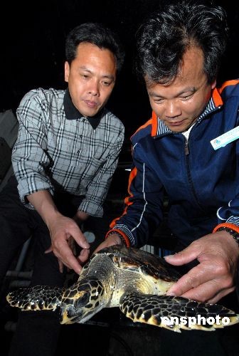 4月13日,福州一漁民將其幾天前在海邊偶然發(fā)現(xiàn)的“玳瑁”海龜送進福州左海海底世界。這只“玳瑁”長約12厘米,重約1750克,嘴如鷹嘴,甲殼為褐色,頜緣鋸齒狀。據(jù)飼養(yǎng)員介紹,這只小海龜大約才2歲,還屬于“嬰兒”狀態(tài)。“玳瑁”又稱十三鱗,屬于國家二級保護動物,一般壽命可達1500歲,成年的玳瑁(約20多歲)身長1米,體重40~60公斤,主要生長于熱帶及亞熱帶地區(qū)的暖水性海洋。該類海龜在中國主要分布于臺灣、福建和海南等沿海一帶海域。 中新社發(fā) 穆長梓 攝