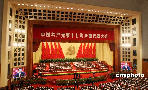 中國共產黨第十七次全國代表大會10月21日上午在北京人民大會堂閉幕。大會在選舉產生新一屆中央委員會和中央紀律檢查委員會后,以舉手表決的方式通過關于十六屆中央委員會報告的決議、關于中央紀律檢查委員會工作報告的決議、關于《中國共產黨章程(修正案)》的決議。中新社發 任晨鳴 攝