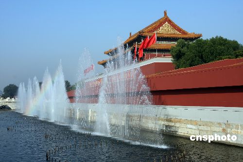 10月21日,北京天安門噴泉水池映彩虹。當日,中共十七大在北京人民大會堂閉幕。中新社發 鄭雄增 攝