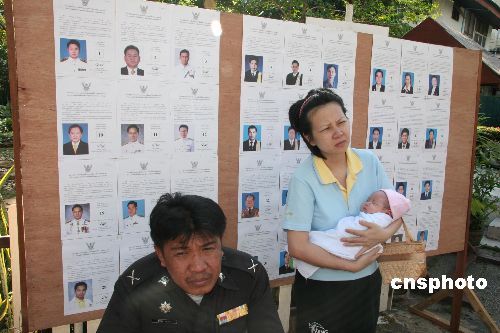 圖為設在曼谷市區拉察唷庭路一個投票點,一個懷抱嬰兒的選民在等待投票。