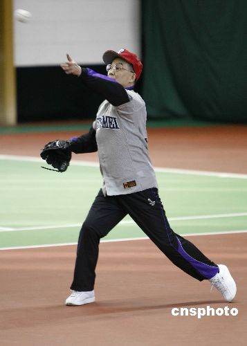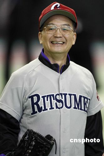 溫家寶身著35號球衣應約和福田康夫切磋棒球球藝