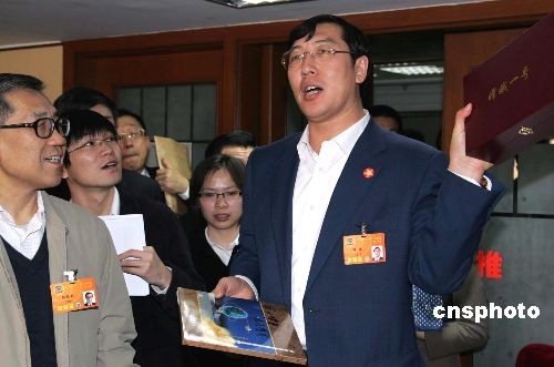 三月四日,在全國政協小組討論會上,政協委員、億陽集團董事長鄧偉向委員們贈送“嫦娥一號”模型。中新社發 潘索菲 攝