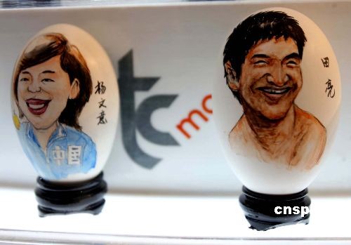 近日,香港世貿(mào)中心以奧運為主題,配合傳統(tǒng)民間藝術舉辦“復活蛋藝展”,給香港觀眾帶來充滿特色的蛋藝展覽。三部分二百件的彩繪蛋畫、蛋雕和卵石畫作品栩栩如生。圖為奧運金牌風云人物田亮、楊文意蛋雕。中新社發(fā) 洪少葵 攝