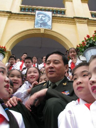3月19日,中央電視臺“心連心”藝術團到廣西龍州縣革命老區慰問演出,圖為鄧小平的扮演者盧奇在紅八軍軍部舊址與當地小學生親切交談。中新社發 夏曉弘 攝