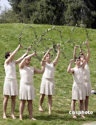 五名男祭司用橄欖枝編成的圓環組成了奧林匹克五環的形狀。