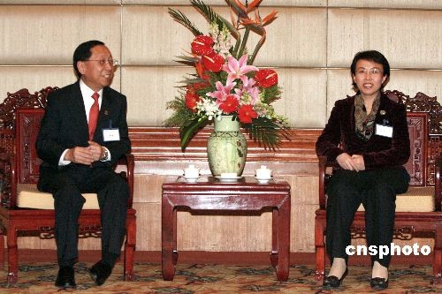 3月31日晚,北京市政府與中國香港商會座談會在北京舉行。北京市副市長程紅(右)與中國香港商會會長樊宇豪在會前交流。中新社發 廖文靜 攝