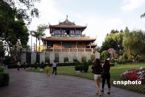 赤嵌樓位于臺南市中區赤嵌樓與民族路交叉口,原為荷蘭人所建。早期的漢人稱荷蘭人為紅毛,所以也把赤嵌樓叫做紅毛樓,或稱番仔樓;目前赤嵌樓列為國家一級古跡,也是臺南代表性的名勝,赤嵌樓的文物與建筑歷經荷蘭、明鄭及滿清時代,初建于公元1650年,其建材據說皆由荷蘭人自海外運來,稱為普羅民遮城,系荷蘭人在漢人起義抗荷的郭懷一事件后所興建的。在鄭成功攻占臺灣以后,曾經改普羅民遮城為“東都承天府”,并以赤嵌樓做為全島最高的行政機構,隔臺江與今安平古堡相對,十分具有歷史與文化的價值。中新社發 杜洋 攝
