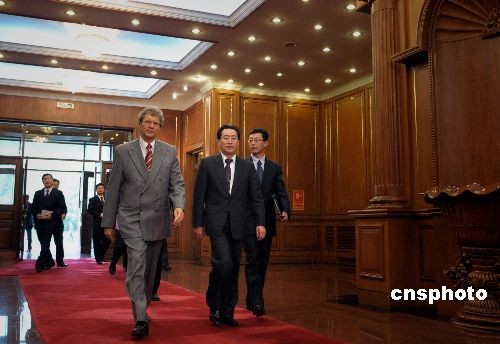 四月九日,朝核問題六方會談中方團長武大偉在北京釣魚臺國賓館會晤俄方代表俄駐華大使拉佐夫。中新社發 廖攀 攝