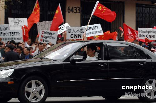 當(dāng)?shù)貢r(shí)間4月19日上午,一名抗議者一手揮舞五星紅旗、一手緊握方向盤駕車經(jīng)過示威現(xiàn)場。洛杉磯當(dāng)天爆發(fā)十幾年來最大規(guī)模的華人華僑抗議示威活動(dòng)。數(shù)千名華人華僑和留學(xué)生在CNN洛杉磯分部門前參加和平示威,要求CNN向公開鄭重道歉,并開除卡弗蒂。中新社發(fā) 張煒 攝