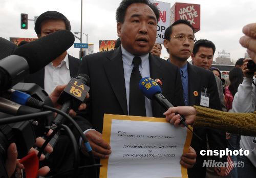 當地時間4月19日上午,示威活動現場總指揮陳軍(中)準備向CNN遞交抗議信,但最終CNN方面無人出面接受抗議書。洛杉磯當天爆發十幾年來最大規模的華人華僑抗議示威活動。數千名華人華僑和留學生在CNN洛杉磯分部門前參加和平示威,要求CNN向公開鄭重道歉,并開除卡弗蒂。中新社發 張煒 攝