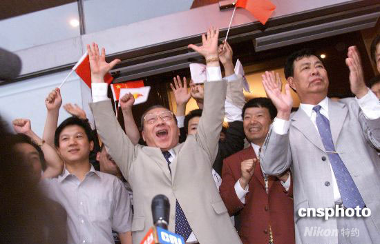 2001年7月13日,在莫斯科世界貿易中心舉行的國際奧委會112次會議中,北京獲得2008年奧運會舉辦權,代表團成員們歡慶勝利。中新社發 王瑤 攝