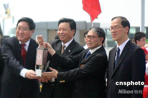 北京奧組委執行副主席楊樹安(左二)與香港奧委會會長霍震霆(右二)、中聯辦主任高祀仁(左一)等共舉圣火燈。 中新社發 沈晨 攝