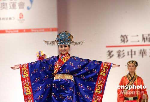五月三日,香港各界青少年迎奧運(yùn)系列活動委員會在香港會展中心舉辦“多彩中華迎奧運(yùn) 人文奧運(yùn)大匯演”。圖為模特在先進(jìn)燈光效果襯托下,展示珍貴歷史服飾。中新社發(fā) 洪少葵 攝