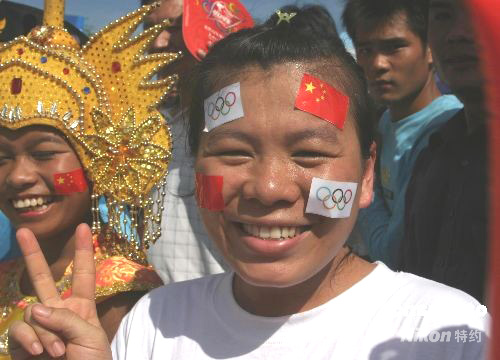 一名歸僑女子在臉上貼滿奧運五環旗和五星紅旗,滿懷欣喜迎圣火。中新社發 尹海明 攝