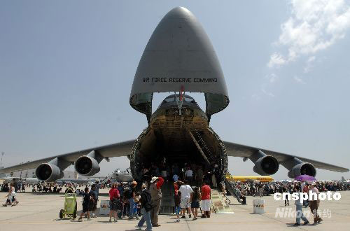 位于美國南加州河濱縣的一個美國空軍預備基地當地時間5月4日舉行規模盛大的航空展和飛行表演。C-17A全球霸王運輸機、C-5銀河運輸機等空中巨無霸和F-22猛禽戰機等美軍先進軍用飛機亮相展覽,F-22戰機飛行表演、美國空軍“雷鳥”飛行隊的特技表演等令近十萬民眾大飽眼福。圖為民眾參觀空中巨無霸C-5銀河運輸機。中新社發 張煒 攝