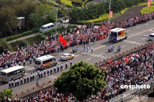 5月11日下午,北京奧運火炬在福州最美的江濱大道進行傳遞,現場盛況空前。 中新社發 王東明 攝