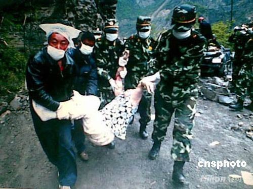5月12日四川汶川發生7.8級地震后,武警重慶總隊黨委積極組織官兵投入抗震救災工作當中,在四川、重慶兩地展開救援保障工作。5月13日7時45分,趕赴汶川地震核心區域的該總隊500名官兵,途徑茂縣沙塆村疊海風景區時看到,因地震和大雨造成山石松動,山上滾下來的石塊將一輛小轎車和一輛從成都到九寨溝的大客車砸中并掩埋,總隊官兵當即就地展開救援工作。中新社發 周中余 攝