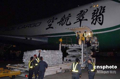 五月十三日深夜,深圳航空旗下的中德合資翡翠航空大型貨機JI7452受命緊急運輸救災物資,四千頂帳篷從天津濱海機場連夜裝機起運,專機運往四川地震災區。中新社發 陳文 攝