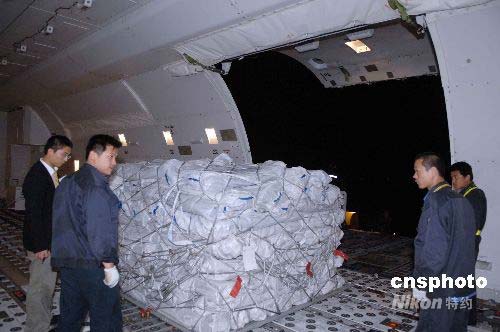5月14日凌晨,深航旗下中德合資翡翠航空大型貨機JI7452航班滿載四千頂救災帳篷,從天津濱海機場裝機運往四川地震災區。中新社發 陳文 攝