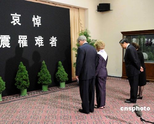 圖為布什夫婦在周文重大使夫婦陪同下在中國大使館向地震遇難者默哀。中新社發 邱江波 攝