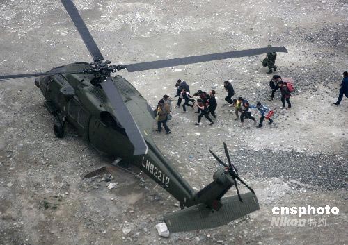 一批震中區(qū)的男女老少正緊急登上成都軍區(qū)陸航團的救援飛機前往成都。中新社發(fā) 賈國榮 攝